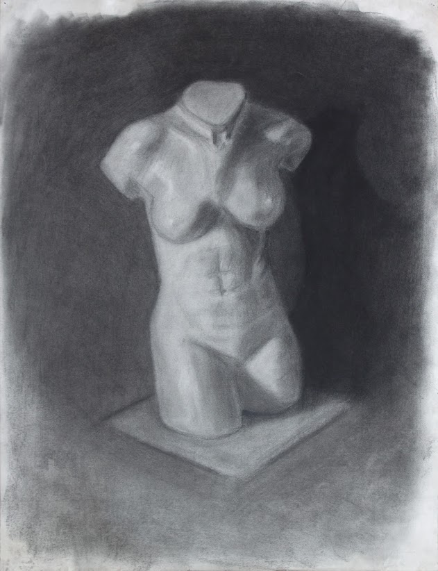 The charcoal drawing of a female bust is a masterful exploration of form and texture. The artist's use of shading and texture creates a sense of depth and dimensionality, drawing the viewer's eye to the intricate details of the bust. The overall effect is one of quiet contemplation and introspection, capturing the essence of the subject.