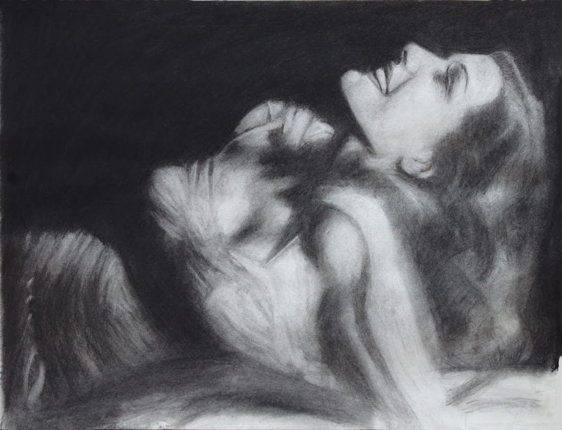 The charcoal drawing of Rita Hayworth is a captivating and intimate portrait. The artist's use of shading and texture creates a sense of depth and dimensionality, drawing the viewer's eye to the subtle nuances of the subject's face. The overall effect is one of quiet contemplation and introspection, capturing the essence of the subject.