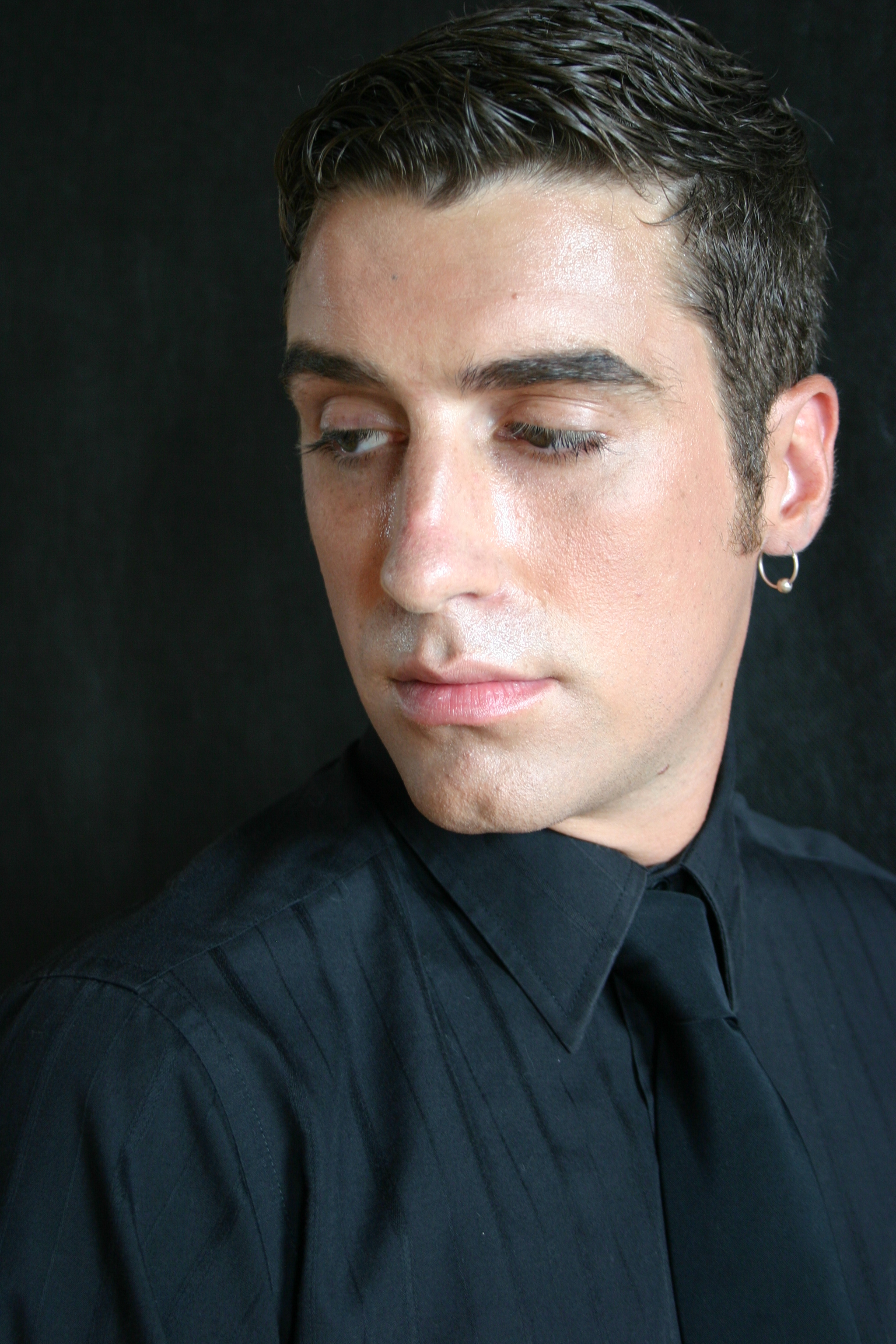 A professional studio portrait of male model Chris Fiedler featuring short, textured dark hair and defined eyebrows. He is dressed in a crisp black collared shirt with a tie, accessorized with a small hoop earring. The lighting highlights the subject's facial features as he gazes downward with a calm, contemplative expression suitable for commercial or editorial use.